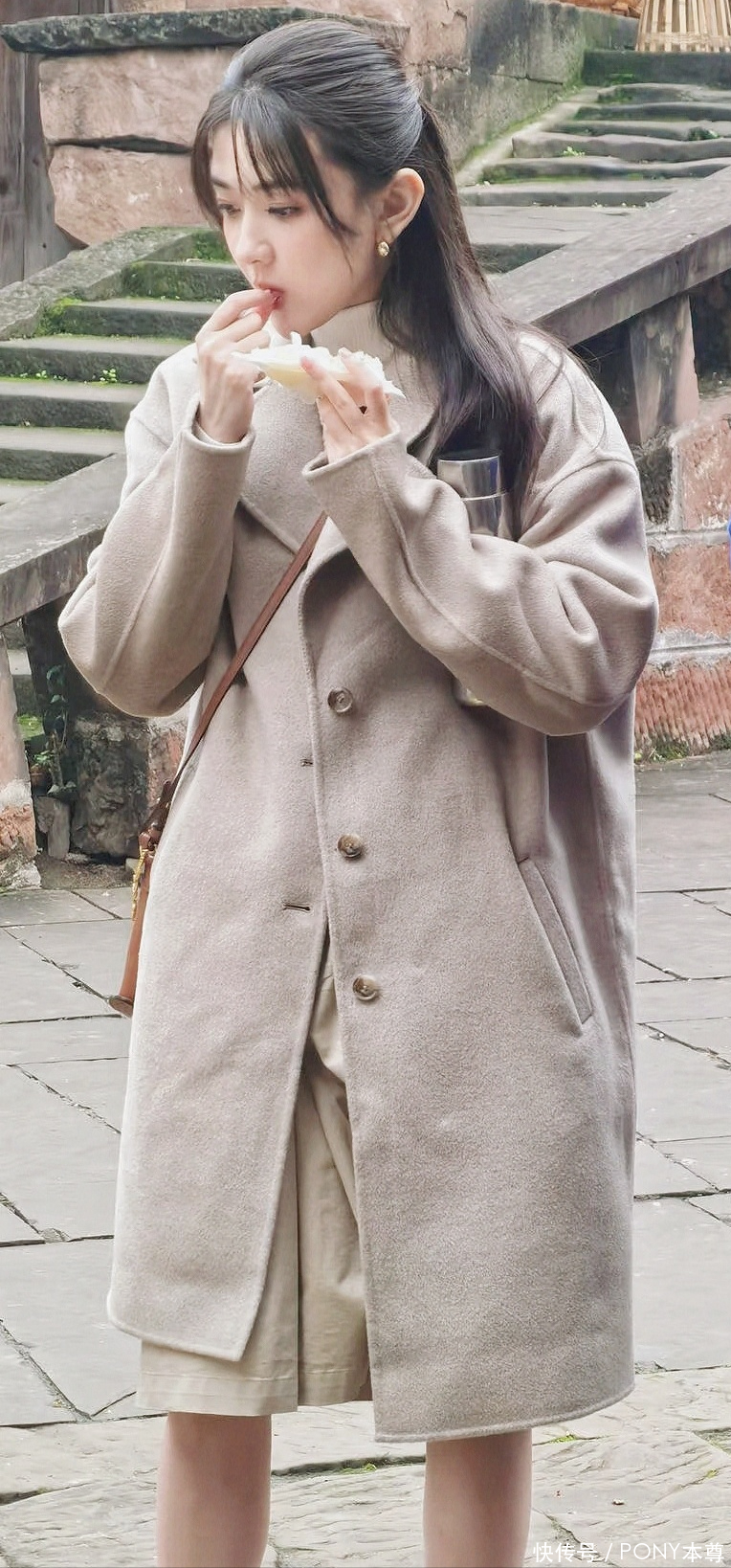 下半身搭配的卡其色半身裙,则是色彩搭配的 “点睛之笔”:卡其色介于灰色与白色之间,柔和不张扬,既与灰色大衣形成和谐过渡,又不会让白色内搭显得突兀,整套造型的色彩统一在 “低饱和高级色系” 中,尽显沉稳从容;半身裙的版型宽松有度,裙摆自然垂坠,既能遮盖腿部线条的小瑕疵,又能在行走间增添灵动气息,配合高领衫的利落,形成 “上紧下松” 的搭配节奏,让身形比例更显匀称,完美诠释 “不刻意露肤,也能藏住好身材”。