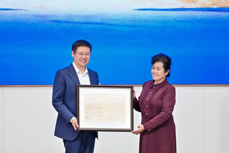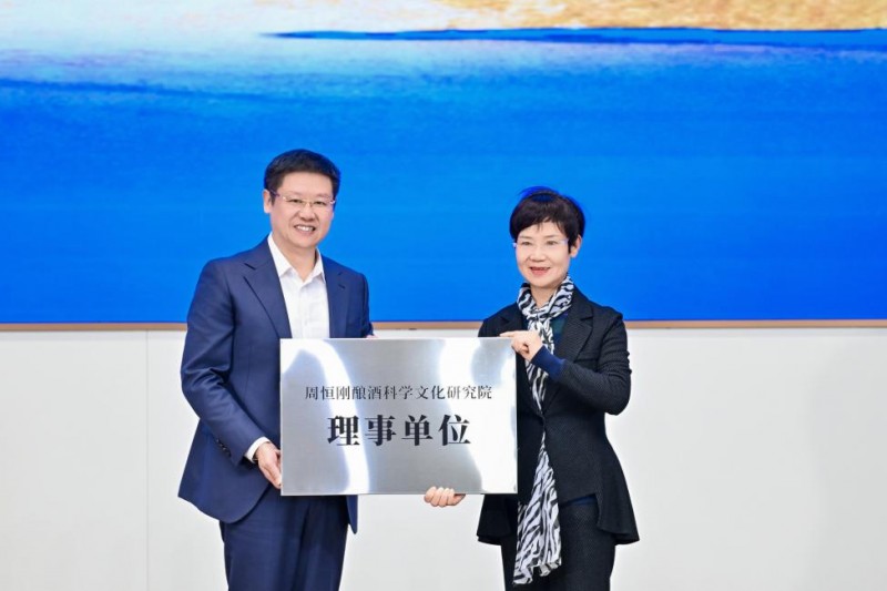 “85鉴定”委员会主任委员周恒刚之女、周恒刚酿酒科学文化研究院理事会主席周心明,向珍酒颁发“周恒刚酿酒科学文化研究院理事单位”牌匾。