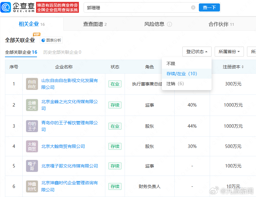 值得注意的是,此前,谢孟伟曾因民间借贷纠纷被河南省郑州市管城回族区人民法院执行171万余元,并被限制高消费。企查查显示,谢孟伟(嘎子哥)共关联4家企业,目前均已注销。谢孟伟的妻子郭珊珊共关联16家企业,其中10家为存续状态,包括北京嘎子哥文化传媒有限公司等。