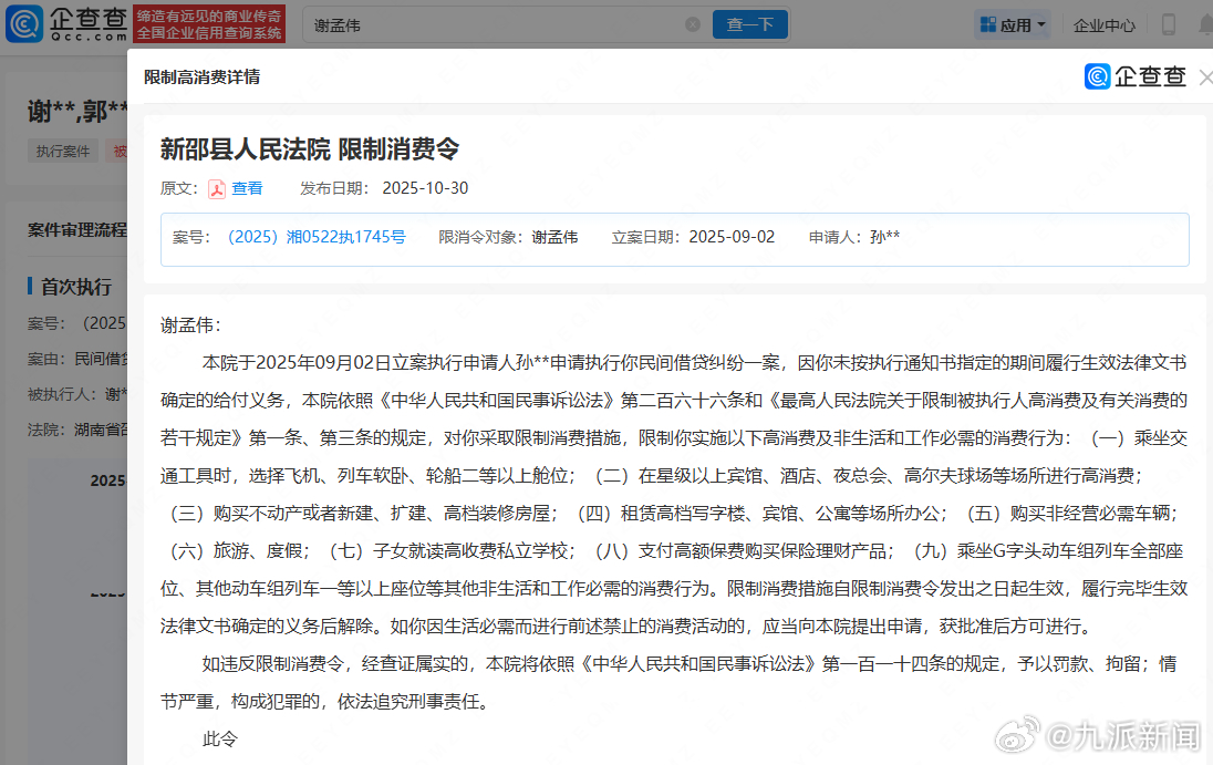 11月4日,九派新闻从企查查APP获悉,因未按指定期间履行生效法律文书确定的给付义务,谢孟伟(嘎子哥)及郭珊珊(嘎子哥妻子)被限制高消费,涉及民间借贷纠纷案件,执行法院为新邵县人民法院。今年9月,二人已因此案被执行210万余元。